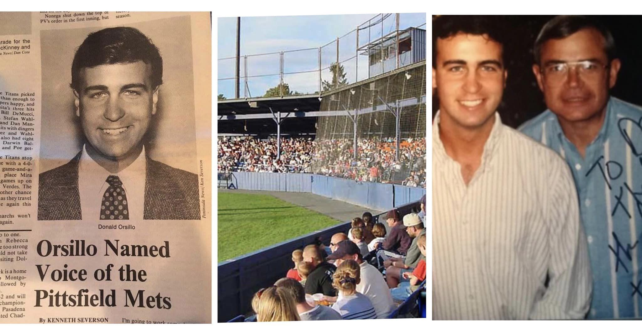 Left: news story announcing Orsillo’s first broadcasting job in 1991; Middle: the broadcaster’s booth in Pittsfield; Right: Orsillo started as an intern for Joe Castiglione (pictured) and Ken Coleman, radio voices of the Red Sox.