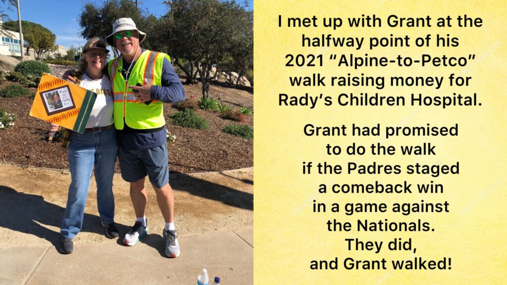Grant had appeared on a few guest spots for 760 KFMB radio and enjoyed it. He put in a call to then-Padres executive Bill Adams, letting him know he was available for any broadcasting work that might come up. Adams offered Grant three games as a color analyst, which led to three more, and the rest is history. The 2023 season will be Grant’s 28th year broadcasting Padres baseball.