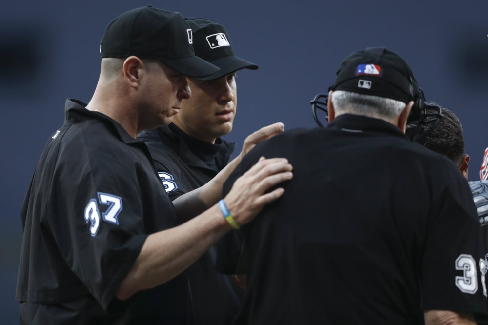 Home plate umpire Dana DeMuth was hit on the left forearm by a foul tip in the first inning and was replaced by first base umpire Angel Hernandez, with only three umpires on the field for the rest of the game.