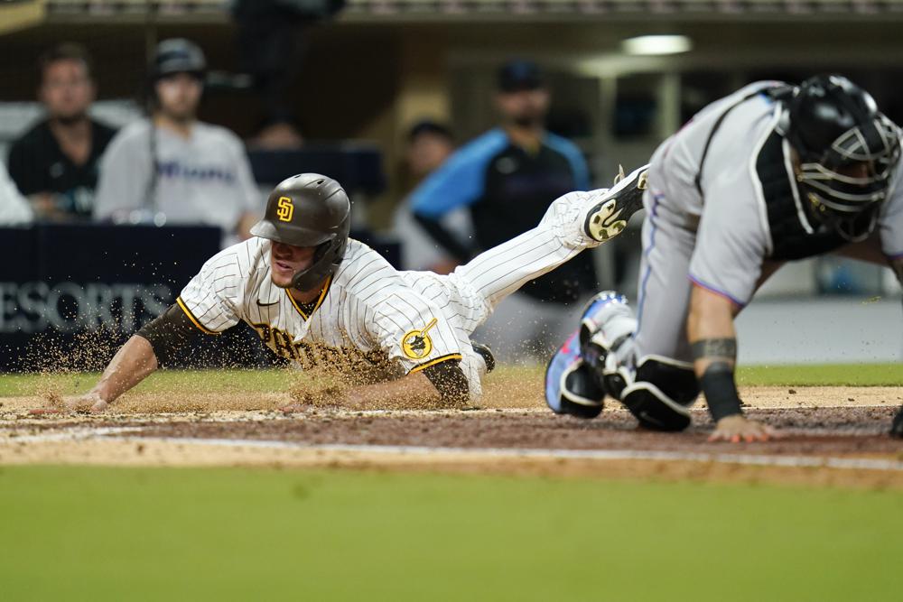 Braxton Garrett (1-1, 4.65) gave up five runs on eight hits and a walk with four strikeouts over three and a third innings. Jake Cronenworth‘s double drove in Manny Machado and Austin Nola doubled to score Cronenworth in the first inning. Wil Myers scored in the second inning when pinch-hitter Brian O’Grady ground into a force out. Garrett’s wild pitch to Tommy Pham with the bases loaded allowed Eric Hosmer to score and Pham singled to drive in Myers in the fourth inning. Adam Frazier scored on Nola’s seventh inning single.