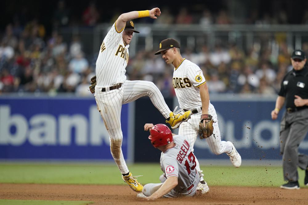 Mike Mayers (4-5, 4.34) gave up two runs on three hits and a walk with a strikeout in one and two-thirds innings as the Angels’ bullpen game opener. All eight Padres’ runs came in the second inning. Adam Frazier doubled to drive in Wil Myers, Jake Cronenworth singled to score Darvish, Fernando Tatis Jr. drew a bases-loaded walk to score Trent Grisham, Eric Hosmer drew a bases-loaded walk to score Cronenworth, Myers drew a bases-loaded walk in his second plate appearance of the inning to score Machado, a wild pitch by Jake Petricka to Frazier scored Tatis Jr., and Frazier singled to drive in Hosmer & Myers.