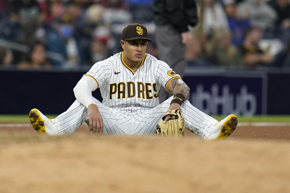 San Diego Padres third baseman Manny Machado looks on after diving and missing a ball hit for a single by Chicago Cubs’ Eric Sogard during the seventh inning of a baseball game Monday, June 7, 2021, in San Diego. (AP Photo/Gregory Bull)
