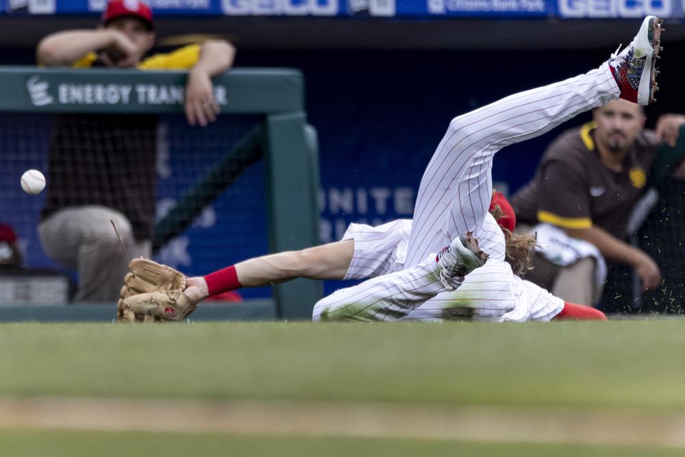 Philadelphia Phillies third baseman Alec Bohm dives on a foul ball from San Diego Padres’ Trent Grisham during the fourth inning of a baseball game, Friday, July 2, 2021, in Philadelphia. (AP Photo/Laurence Kesterson)