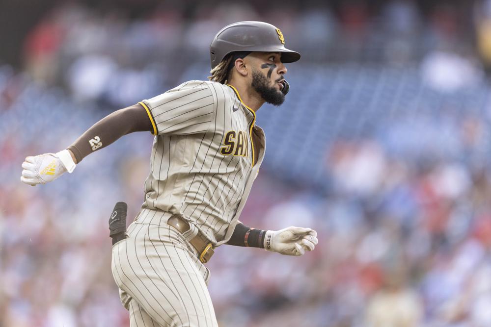San Diego Padres’ Fernando Tatis Jr. runs to first base on a double during the fourth inning of a baseball game against the Philadelphia Phillies, Friday, July 2, 2021, in Philadelphia. (AP Photo/Laurence Kesterson)
